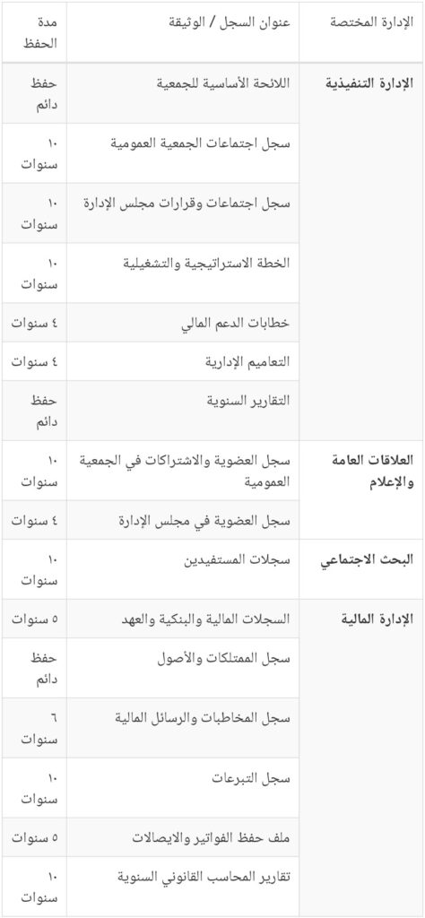 - يجب على الجمعية أن تحفظ الوثائق بطريقة منظمة حتى يسهل الرجوع للوثائق ولضمان عدم الوقوع في مظنة الفقدان أو السرقة أو التلف.